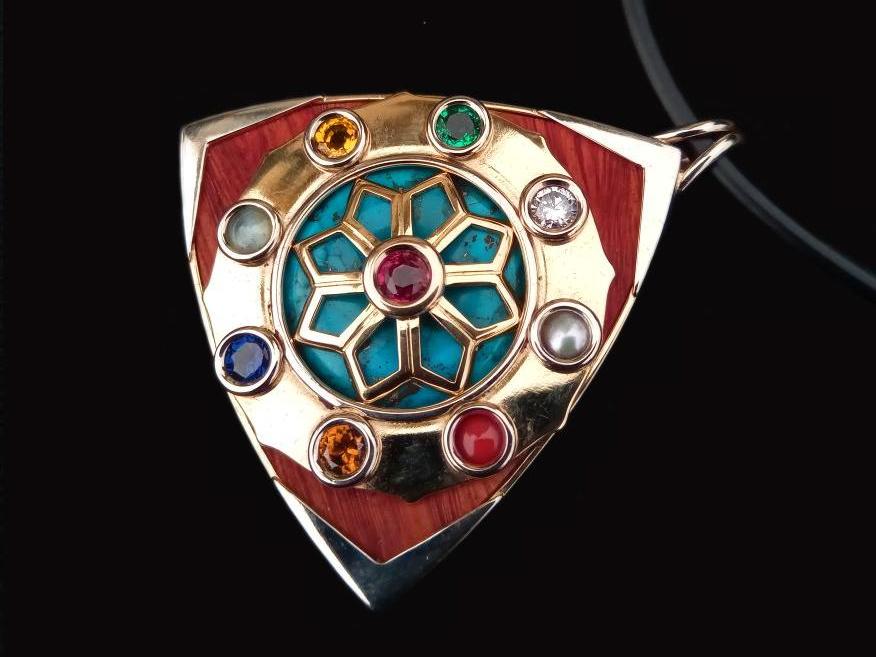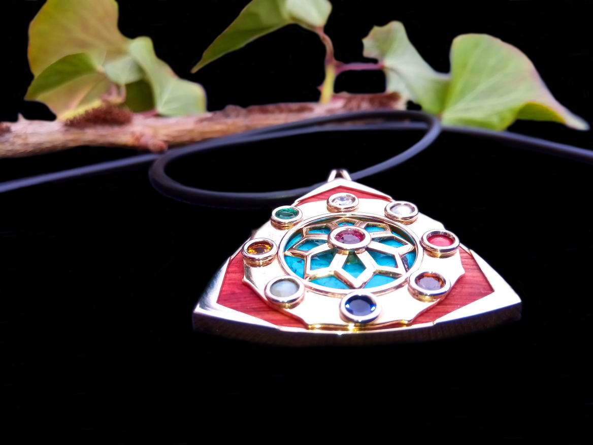 - 9 Edelsteine nach Jyotish - Gelbgold 18 Karat - Weissgold 18 Karat - Türkis - Wurzelholz